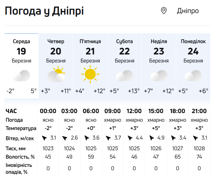 - У Дніпрі температура вночі буде -2°, вдень +6°, невелика хмарність.