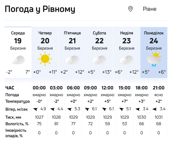 - У Рівному сьогодні очікується невелика хмарність, вночі -2°, вдень +6°.