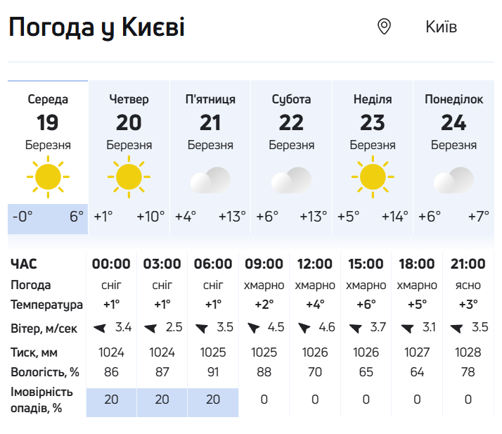 Стовпчики термометрів у середу покажуть від +2° на сході до +8° на заході. Очікується хмарна погода, місцями з проясненнями. В окремих областях на півночі та сході очікуються опади у вигляді мокрого снігу.