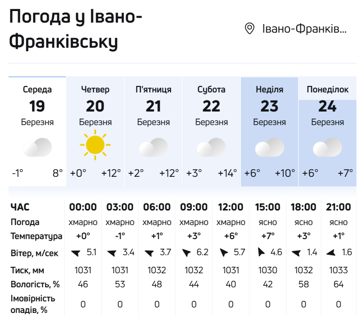 - У Тернополі 19 березня вночі буде -1°, вдень +7°, невелика хмарність.