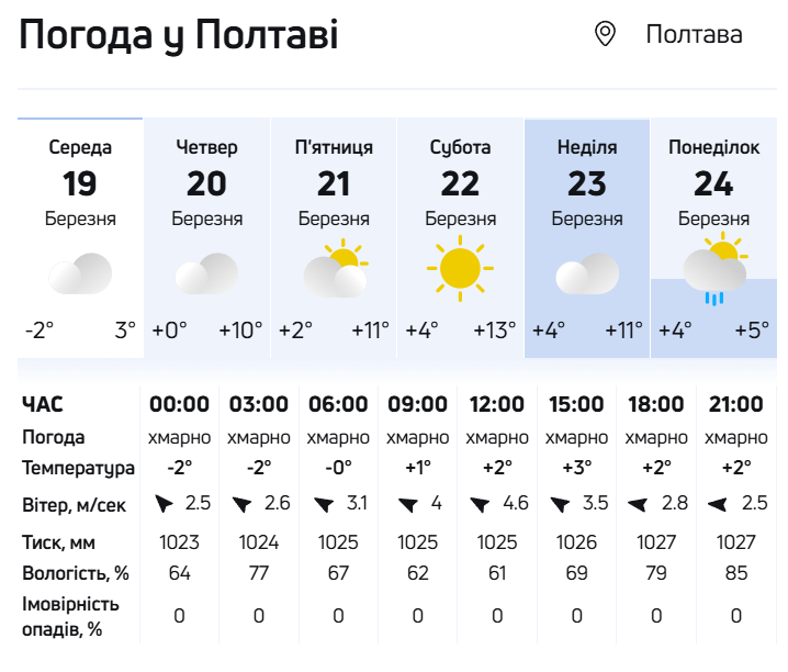- У Полтаві - невелика хмарність, температура повітря -3°...+4°.