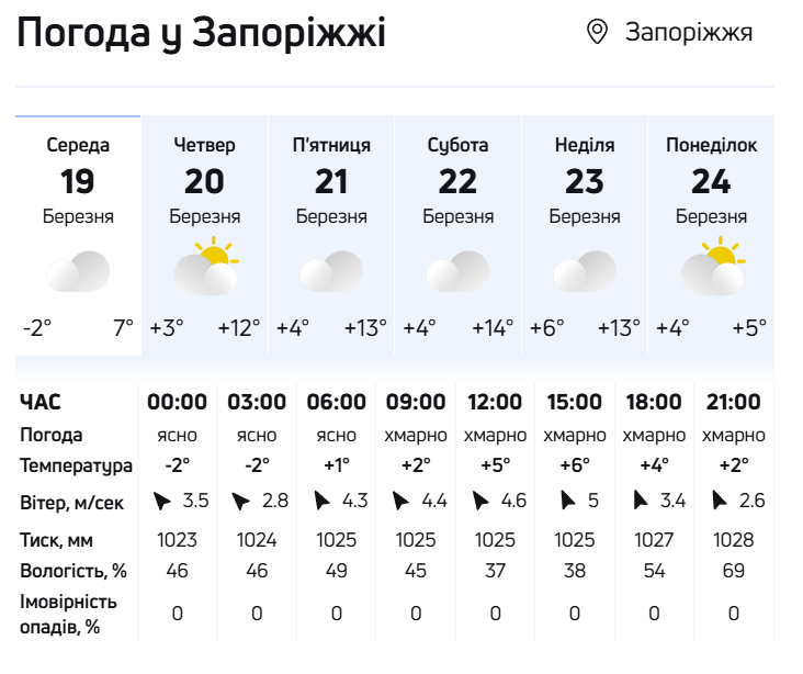 - У Запоріжжі температура вночі -2°, вдень +6°, невелика хмарність.