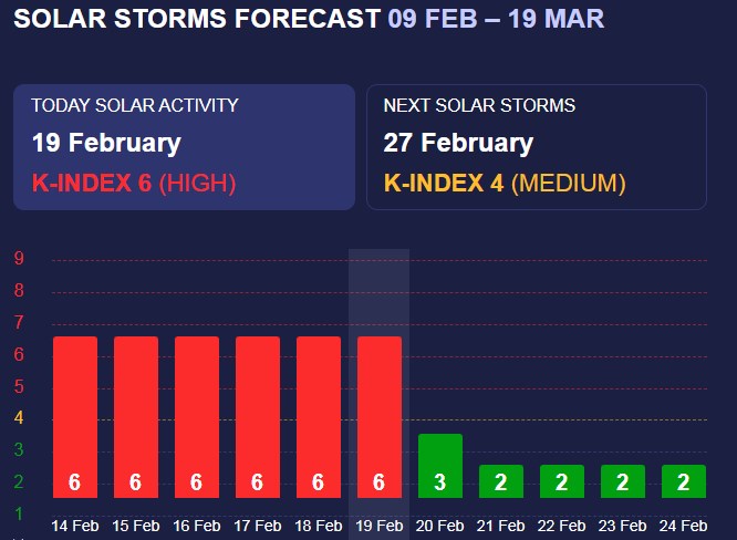 У середу, 19 лютого, очікується сонячна активність з К-індексом 6 (червоний рівень), що відповідає сильним магнітним бурям, здатним впливати на самопочуття та здров'я метеозалежних людей.