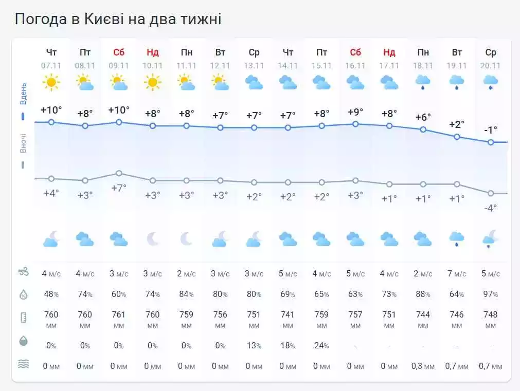 За словами синоптика, температура повітря вночі від 4 тепла до 3 морозу, вдень в Україні 8-го листопада +5…+9 градусів, на півдні та на Закарпатті до +10…+14 градусів.