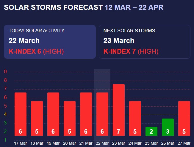 У неділю, 23 березня, очікується сонячна активність з К-індексом 4 (жовтий рівень), що відповідає середнім магнітним бурям.