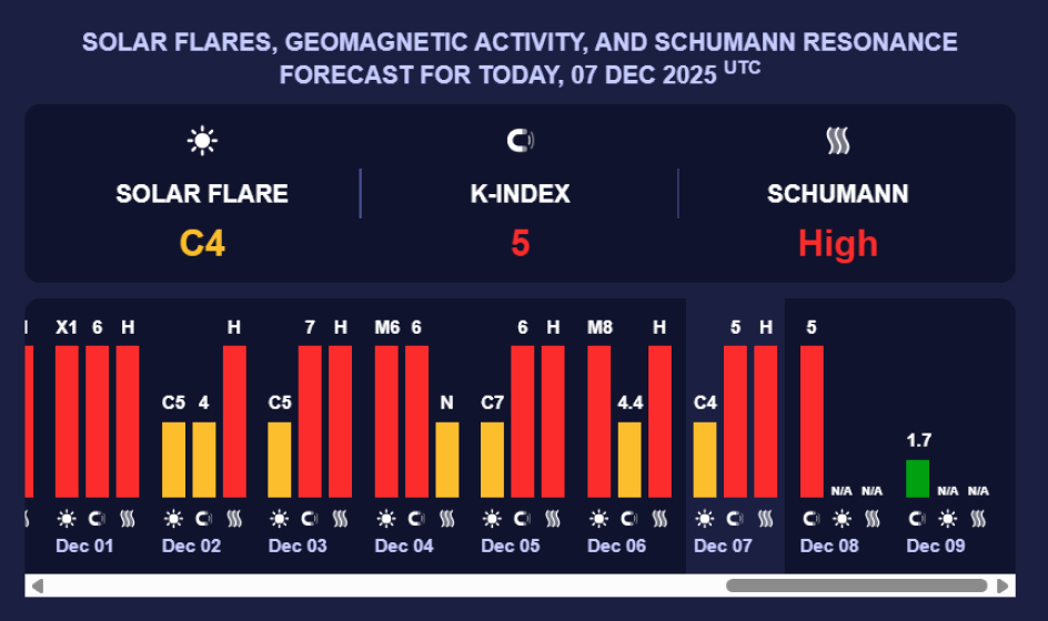 Згідно з даними, 7 грудня очікується посилення геомагнітної активності до К-індексу 5. Цей рівень класифікується як буря середнього рівня, яка вже відчутна для метеозалежних людей та може впливати на роботу зв'язку.