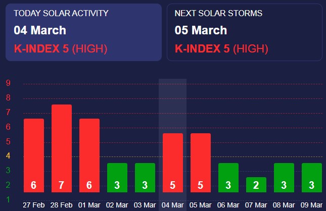 У вівторок, 29 жовтня, очікується сонячна активність з К-індексом 5 (червоний рівень), що відповідає сильним магнітним бурям.