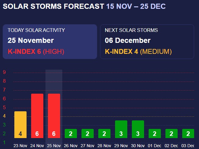 У понеділок, 25 листопада, очікується сонячна активність з К-індексом 6 (червоний рівень), що відповідає сильним магнітним бурям.