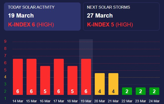 У середу, 19 березня, очікується сонячна активність з К-індексом 6 (червоний рівень), що відповідає сильним магнітним бурям.