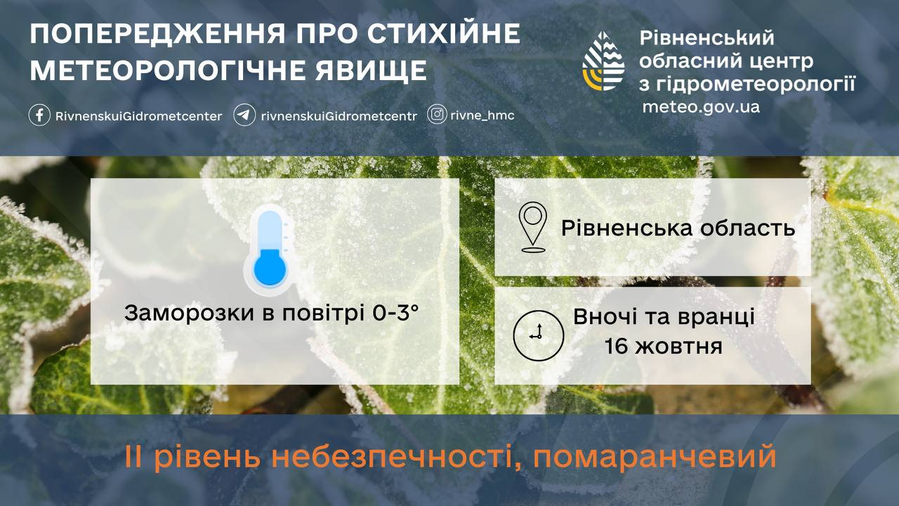Рівненський обласний гідрометцентр попереджає мешканців Рівненської області про небезпечні погодні умови у нічні та ранкові години 16 жовтня. Очікуються заморозки в повітрі від 0 до 3 °C по області та від 0 до 2 °C у Рівному. Денні температури прогнозуються на рівні 8-13 °C по області та 10-12 °C у Рівному.