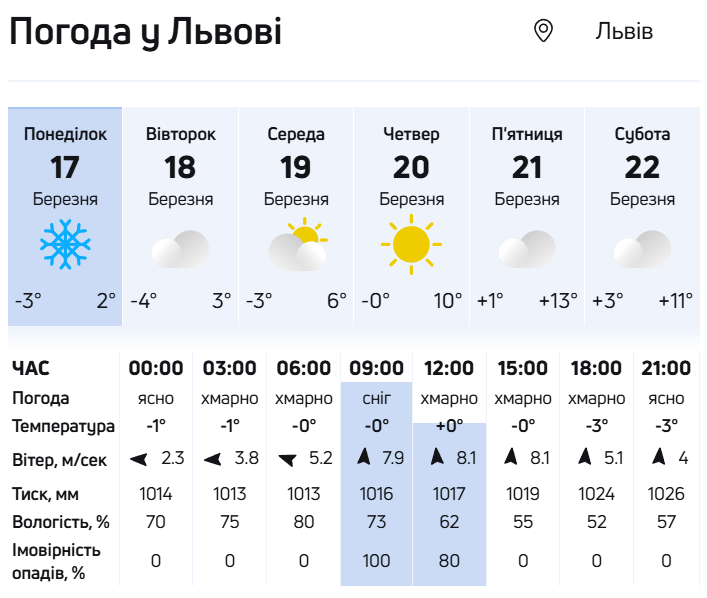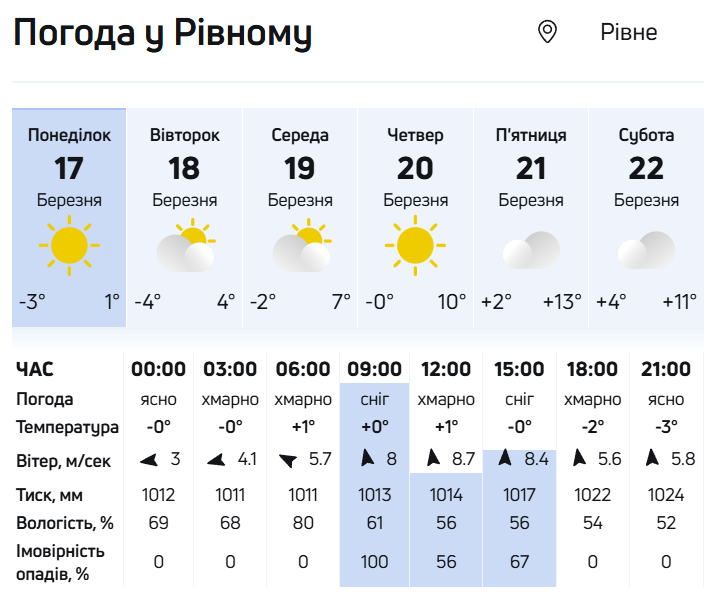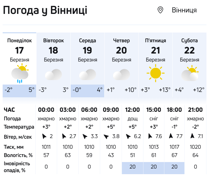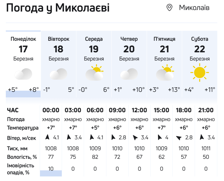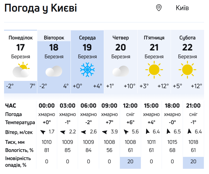 Із середини тижня, 20 березня, погода в Україні почне поліпшуватися. Опади підуть геть і сонця стане більше. Температура підвищиться до +4°...10°, місцями на півдні та заході буде до +11°.