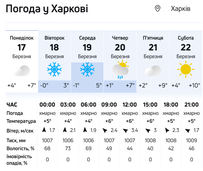 У вівторок, 18 березня, в Україні стане ще холодніше. По всій країні стовпчики термометрів покажуть +1°...+5°, а вночі очікуються морози до -6°. Опади змістяться на лівобережжя країни.