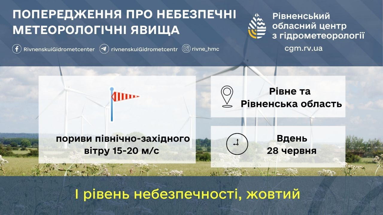 Як повідомляє Рівненський гідрометцентр, вночі по області пройде помірний короткочасний дощ, який триватиме і вдень. Вітер буде північно-західного напрямку, з поривами до 15–20 м/с, що й стало підставою для попередження про I рівень небезпеки.